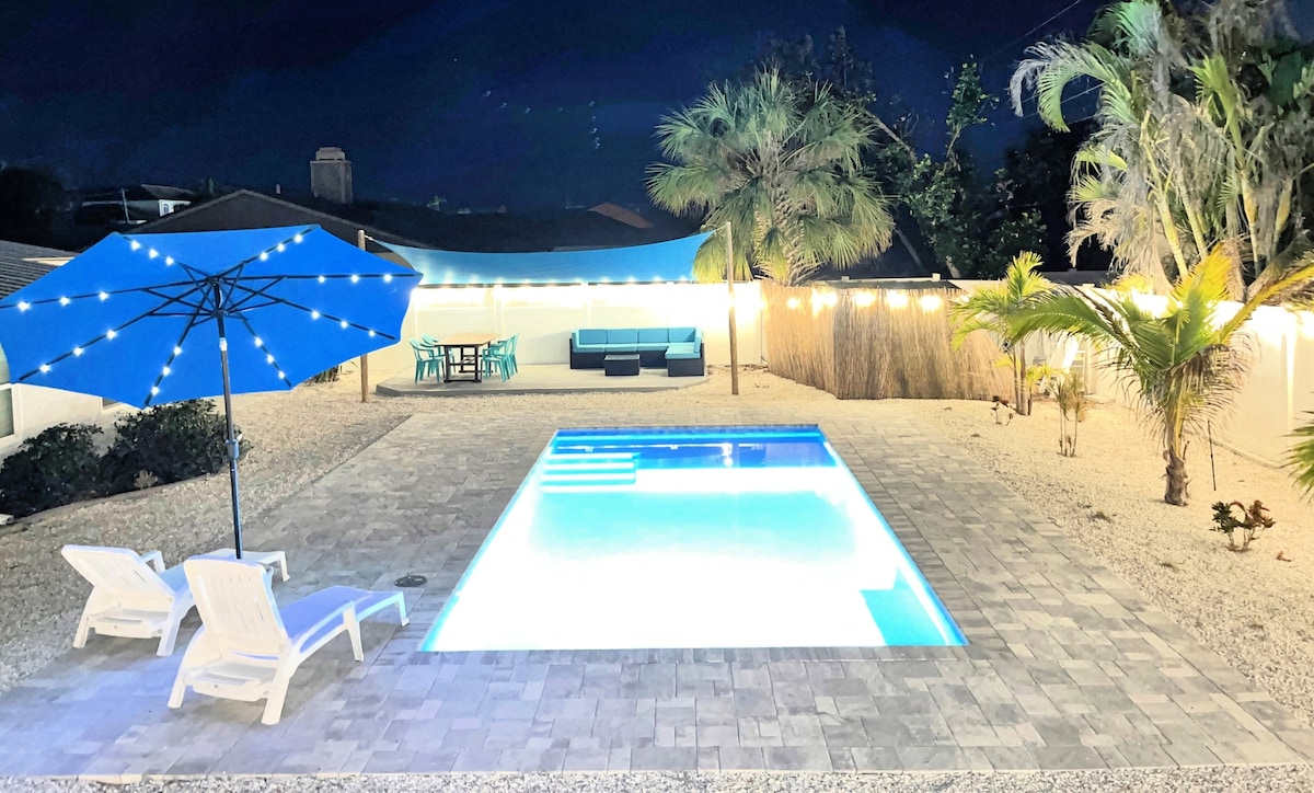 Üdvözlünk a PalmHausban, egy világos és modern, négy hálószobás floridai nyaralóban, amely tökéletes családoknak és csoportoknak. Az otthonban 2 king méretű ágy, 1 queen méretű ágy és 2 egyszemélyes ágy, egy teljesen felszerelt konyha kávézóval és egy hangulatos nappali található elektronikus kandallóval. Élvezd a saját fűtött medencét (akár 30 °C), a kültéri tévét, a grillsütőt, a medence melletti ülőhelyeket és a strandfelszereléseket. Lazíts, pihenj, és élvezd a könnyed tengerparti életet.