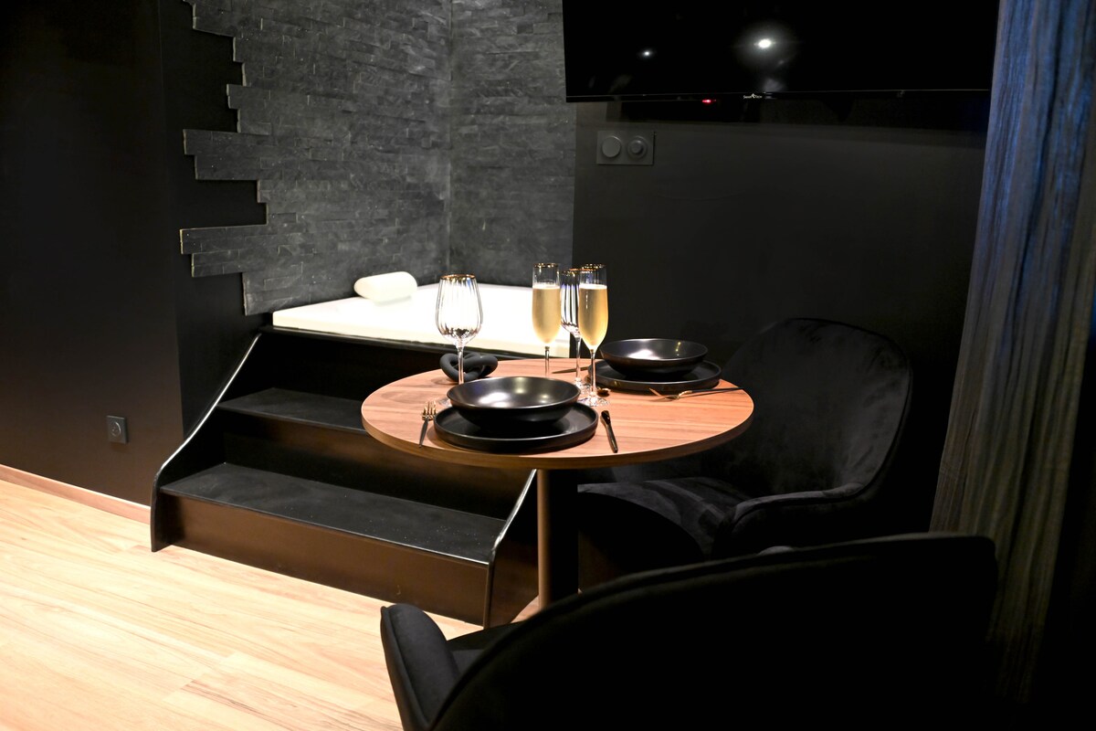 Bienvenue à la BATROOM, Une suite immersive inspirée de l’univers Batman. Plongez dans une ambiance sombre et élégante avec grand lit confortable, balnéo privative et véritable salle cinéma équipée d’une très grande TV pour une expérience spectaculaire. Idéal pour une soirée en amoureux ou entre fans.