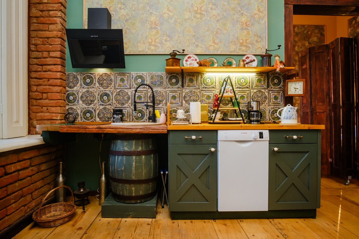 Our apartment is located in the very center of historical part of Tbilisi. We are on the first floor of the famous Georgian painter´s, Elene Akhvlediani museum. The interior of the house is in an authentic Georgian style, following steps of our ancestor who was a painter as well.In a pergola outside you will be able to chill out tasting our family made wine from our eco clean vineyards. Welcome to Tbilisi dear tourist, with our arms wide open-welcome to our house and be our guest!