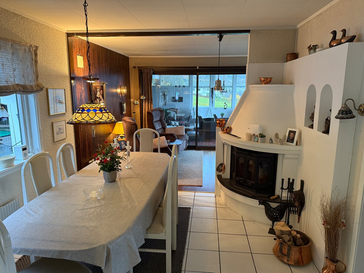 Szállj meg egy aktív farm közepén, gyönyörű természettel és számos túrázási lehetőséggel körülvéve. Nyáron láthatod és hallhatod a ház körül legelésző teheneket, reggelizhetsz egy padon a vízparton, és erdei és hegyi sétákra mehetsz. Télen a nappaliban élvezheted a kandalló melegét, és ha sok hó van, síelhetsz a közeli erdőben lévő ösvényen. Lehetőség van csónakot bérelni a fjordon való evezéshez, vagy használni a fűtött medencét a házban.