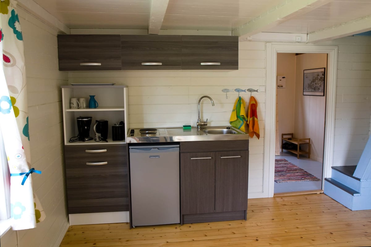 A cozy cabin with a superb location. Long way from neighbors an very tranquil and peaceful. Behind the cabin there is an fantastic area where you can enjoy the sun that never sets. As many of these elderly houses in Lofoten, also this one has a pretty steep stair to the upper floor where the two bedrooms are. On the main floor you find a modern bathroom, living room and kitchen with dining table.