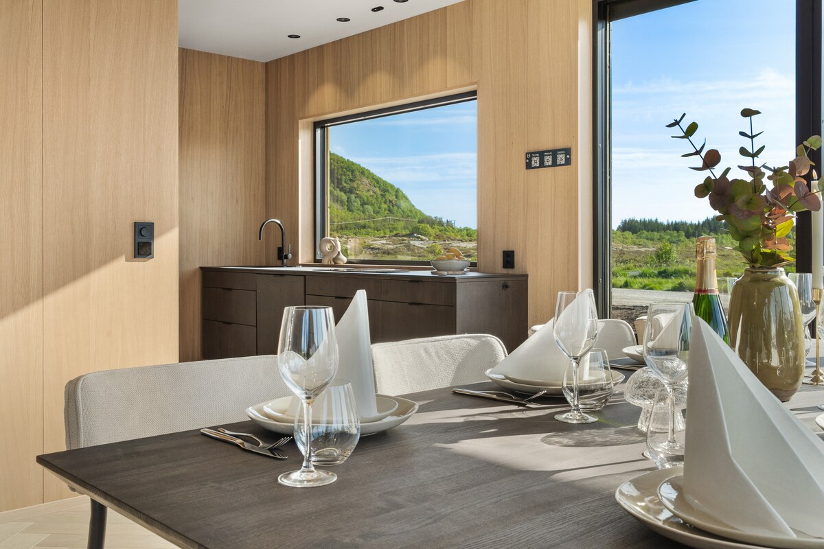 Lofotenben nem is találhatnál központibb helyet. Ebben a fantasztikus víkendházban fényűzően élsz, és minden irányból élvezheted a látványos kilátást. Buksnesfjorden közelében található, amely Leknes városába vezet, amely szintén autóval mindössze 15 perc alatt elérhető, és minden szükséges üzletet, valamint éttermeket és kávézókat kínál. A néhány kőhajításnyira található Mortsundban egy csodálatosan szép étterem és egy élményközpont is található.