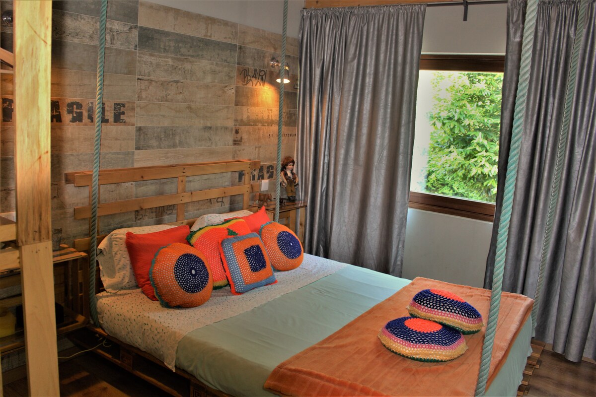Raklapszoba A dekoráció és a bútorzat újrahasznosított anyagokból készült. A cél tehát az, hogy más építészeti megközelítést érjünk el, ugyanakkor érzékenyítsük a természet megőrzését, ahol Quintinha d 'Arga található.