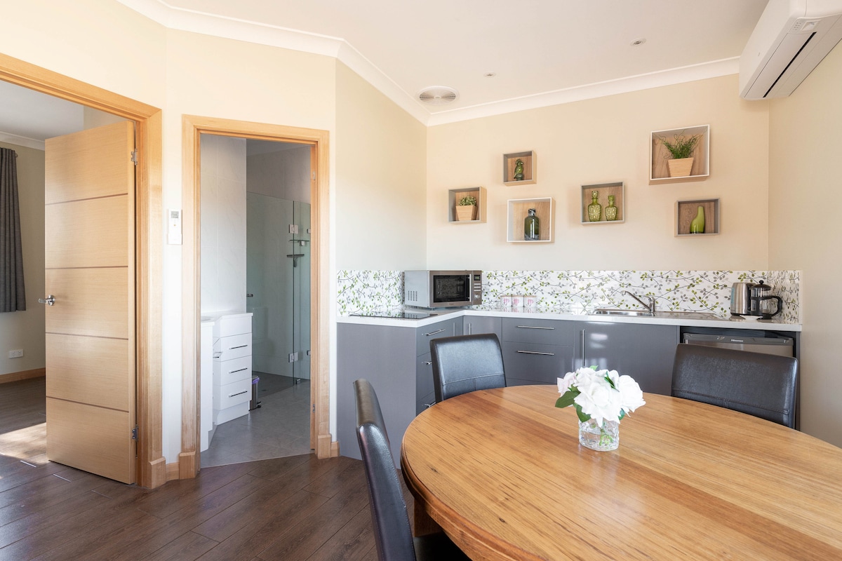 A Vintners Retreat békés menedéket kínál a luxuskivitelű, franciaággyal, egy kényelmes kanapéval, ahol gyönyörködhetsz a fatüzelésű tűzben, vagy értékelheted a hűsítő levegőt. A saját bejárattal rendelkező Retreat egy teljesen privát stúdió, ahol jól érezheted magad. Teljesen felszerelt konyha tűzhellyel, mikrohullámú sütővel és kávégéppel, valamint grillezővel a saját udvarodban, valamint a társalgó / étkező medence használata azt jelenti, hogy szabadtéri ételeket ehetsz, miközben a látványos naplementéket nézed.