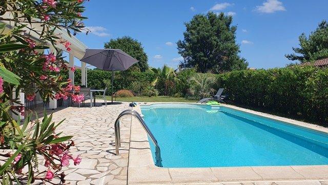 Belle maison landaise rénovée, à la décoration cosy et chaleureuse, disposant de 4 chambres doubles équipées de télévisions, 2 salles de bain, cuisine séparée, wifi. Une terrasse à l'avant avec espace repas, barbecue/cheminée et jardin à l'arrière avec piscine 7x4m, espace repas, table de ping pong et bains de soleil à disposition. La propriété est située à 1.1kms de la plage du lac de Léon, à 9kms de l'océan et les commerces sont à proximité. Jardin clôturé, animaux acceptés.