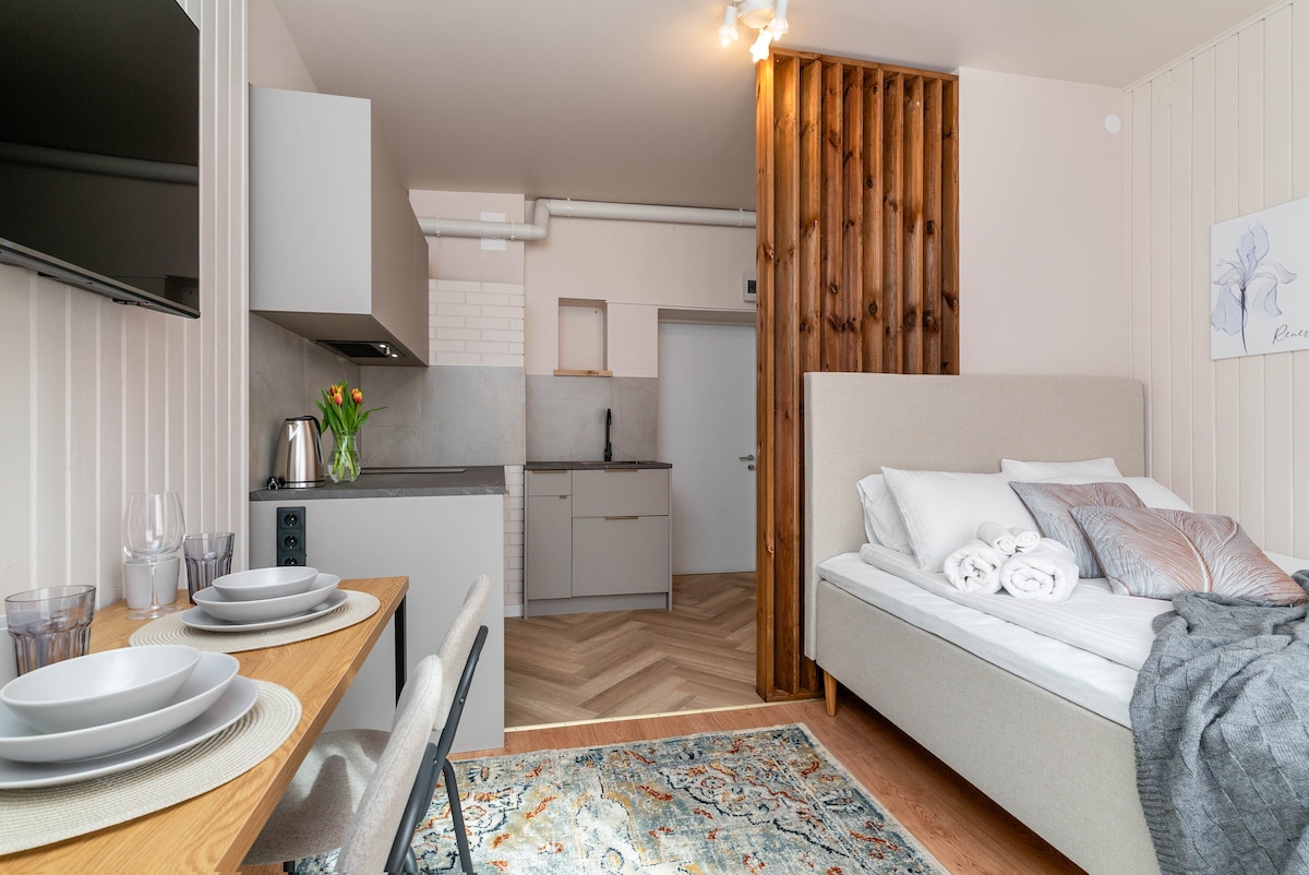 Az összes kényelmi szolgáltatással rendelkező stúdió nagyszerű szálláshely a nyugodt központi városrészben, ahol Viljandi legjobb kávézói, parkjai és strandjai sétatávolságra találhatók. A lakás ízlésesen berendezett, és mindent tartalmaz, amire szükséged van a gondtalan élethez. A háztartásban ökocímke-tanúsítvánnyal rendelkező termékeket és eszközöket használunk, hogy a tiszta légkör még jobb legyen a pihenés szempontjából.