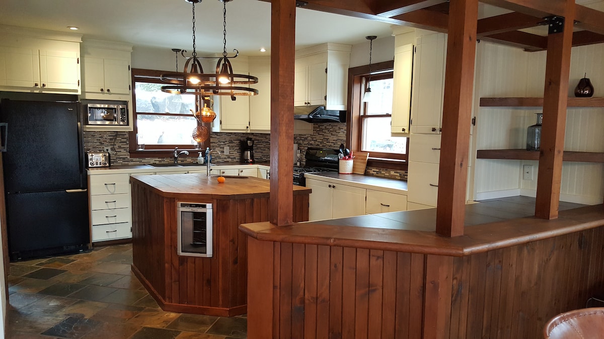 Üdvözöl a Meraki Chalet, a folyóparti szálláshelyed Val-Morinban, mindössze egy órányira Montrealból. A tél itt azt jelenti, hogy elmerülünk a nagy, fedett, 9 személyes pezsgőfürdőben, összegyűlünk a tűzrakóhely körül, vagy hótalpon sétálunk a saját 500 méteres erdei ösvényünkön. Szeretnél síelni? Belle Neige és Mont Saint-Sauveur mindössze néhány percre található. A 4 hálószobával, rengeteg lakóterülettel és akár 14 fő befogadására is alkalmas faház családoknak és barátoknak készült, akik kényelmet, szórakozást és hangulatos laurentiai kiruccanást szeretnének.