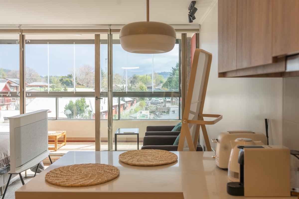 Hangulatos egy hálószobás apartman saját fürdőszobával, nappali-étkezővel és nyitott konyhával, egy gyönyörű kertekkel rendelkező privát társasházban. Tökéletes 2 vendégnek. Élvezd a következőket: 🏊♂️ Medence gyerekeknek és felnőtteknek 🏰 Játszótér gyerekeknek 🌲 Klubház 🧖♂️ Szauna és pezsgőfürdő (felár ellenében) 📍 Ideális elhelyezkedés, közel a következőkhöz: 🏘️ 5 percre Pucón belvárosától 🏞️ Strandok ⛷️ 25 percre a síközponttól ♨️ 40 percre a Huife forró forrásoktól 🌿 25 percre a botanikus termálparktól 🌄