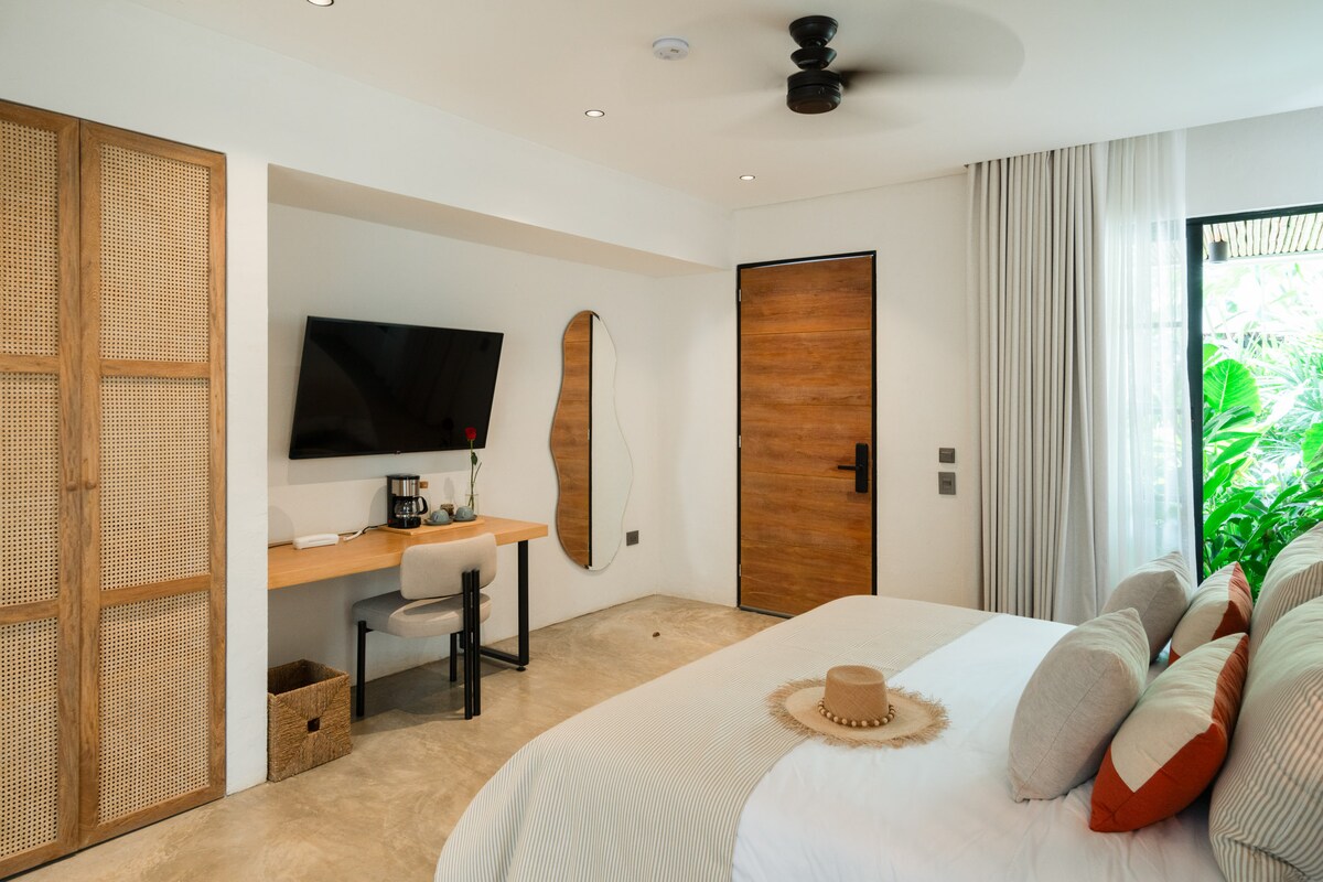 Cómoda habitación con cama doble, sofá cama, baño privado y balcón. Ideal para parejas, acompañantes médicos o viajeros que buscan un espacio tranquilo y funcional. Disfruta de WiFi, acceso a cocina compartida, comedor y sala de TV en un ambiente natural con estilo boho, muy cerca del Hospital Departamental y centros médicos en Villavicencio.