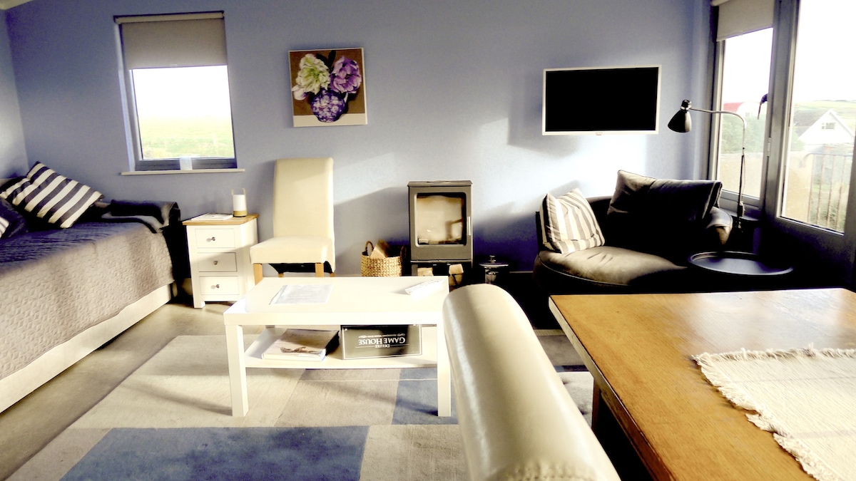 Az E Gray House egy luxusüdülőhely gyönyörű erdei környezetben, közvetlenül a Waterford Greenwayen. Ez csak egy rövid ciklus Dungarvan városába és számos strandra. Bár nehéz lehet a stílusos és kényelmes belső teret hagyni, amikor a tűzhely előtt ülsz, és könyvet olvasol, vagy a kedvenc műsoraidat nézed, amelyek a visszahúzható 180 cm-es képernyőre vetítik. A hangulatos félemeletes hálószobából gyönyörű kilátás nyílik a tengerre, amely gyengéden meggyőz, hogy lassíts, és élvezd az időt
