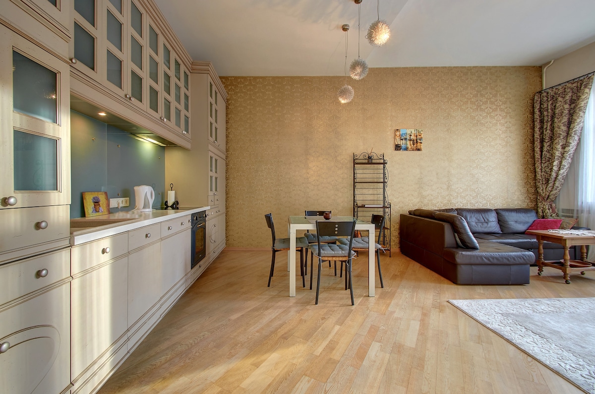 Modern dizájn, egy híres felhőkarcoló felső 24. emeletén. A nagy ablakokból csodálatos kilátás nyílik a városra és azon túlra . A lakásban számos létesítmény található,egy nagy fürdőszoba masszírozó jacuzzival, valamint kiváló minőségű házimozirendszer OLED TV-vel és 12 hangszóróval. Egy bevásárlóközpont felett található, egyik oldalán az Óváros, a másikon az új üzleti negyed, mindkettő sétatávolságra található. Tökéletes pároknak, üzleti utazóknak és családoknak.