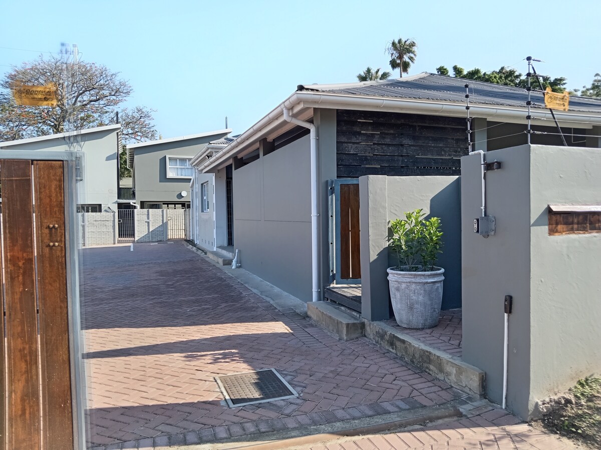 Önellátó stúdiónk tartalék energiával és légkondival kapcsolódik a főépülethez. Tiszta és hangulatos, nyitott elrendezésű stúdió stílusú egység saját bejárattal és saját terasszal. Távoli hozzáférés és utcai parkolás 1 jármű számára. A dupla fülkés, vonóhoroggal ellátott bakkik nem férnek be, ha 2 autó parkol benne – ahol az utcai parkolás általában biztonságos a csendes környékünkön. A Nahoon Beach és a folyó 1,5 km-re, a Spar és az éttermek 500 méterre vannak.
