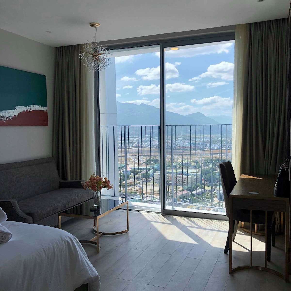 A lakás egy csúcskategóriás és fényűző belső tér, hosszú kanapéval és étkezőasztallal, a lakás erkéllyel rendelkezik, amely a tengerre néz, és dohányozhat. A lakásban kétajtós hűtőszekrény, 55 hüvelykes okostévé és mosógép található. A lakás alatt 12 emeletnyi kereskedelmi központ étterme és kávézója található, a 3. és 4. emeleten Lotte szupermarketek, svédasztal az 5. emeleten, gyermekjáték a 7. emeleten, védőoltások VNVC 10th floor. Van egy végtelenített medence a 12. emeleten, és körülbelül 350 000/vé költséggel használható 1 törülközőért, 1 pohár vízért 4 órán keresztül
