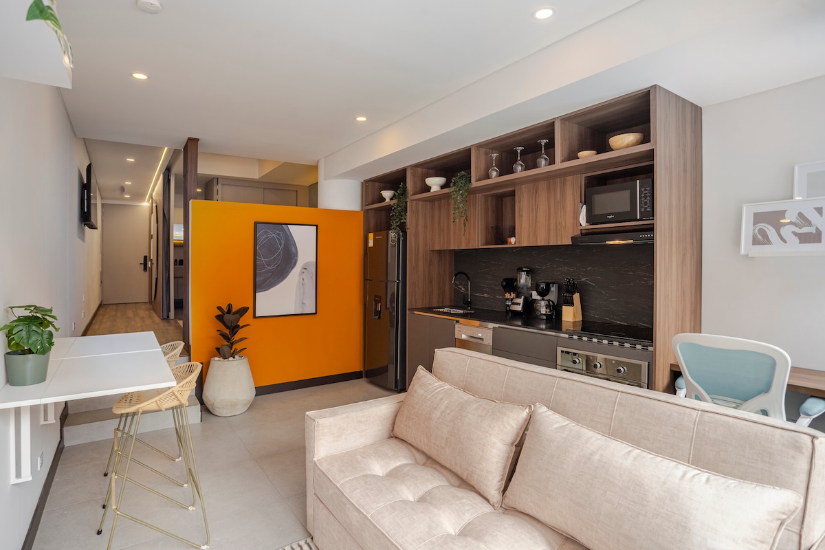 Vive una experiencia increíble en este nuevo Loft de lujo. Con acabados de diseñador, está equipado con una cama doble, WiFi, TV, microondas, waflera, cafetera, nevera, cocina, Escritorio, luz natural, una vista increíble y grandes comodities. Ubicado en un elegante edificio con excelente ubicación cerca de geniales restaurantes, centros comerciales, vías de acceso y transporte público. El edificio cuenta con cuarto de lavadoyplanchado, coworking, terraza 360, área de ejercicios y seguridad 24 h