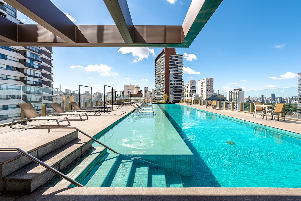 Studio muito bem equipado e com vista deslumbrante de São Paulo, super bem localizado ao lado do metrô linha amarela, supermercados, restaurantes. Fácil acesso ao que a região de Pinheiros e Jardins tem de melhor a oferecer. Prédio com excelente estrutura (lavanderia compartilhada, piscina, espaço fitness, coworking, lounge, horta) com tudo que você precisa para curtir o melhor de Sampa!