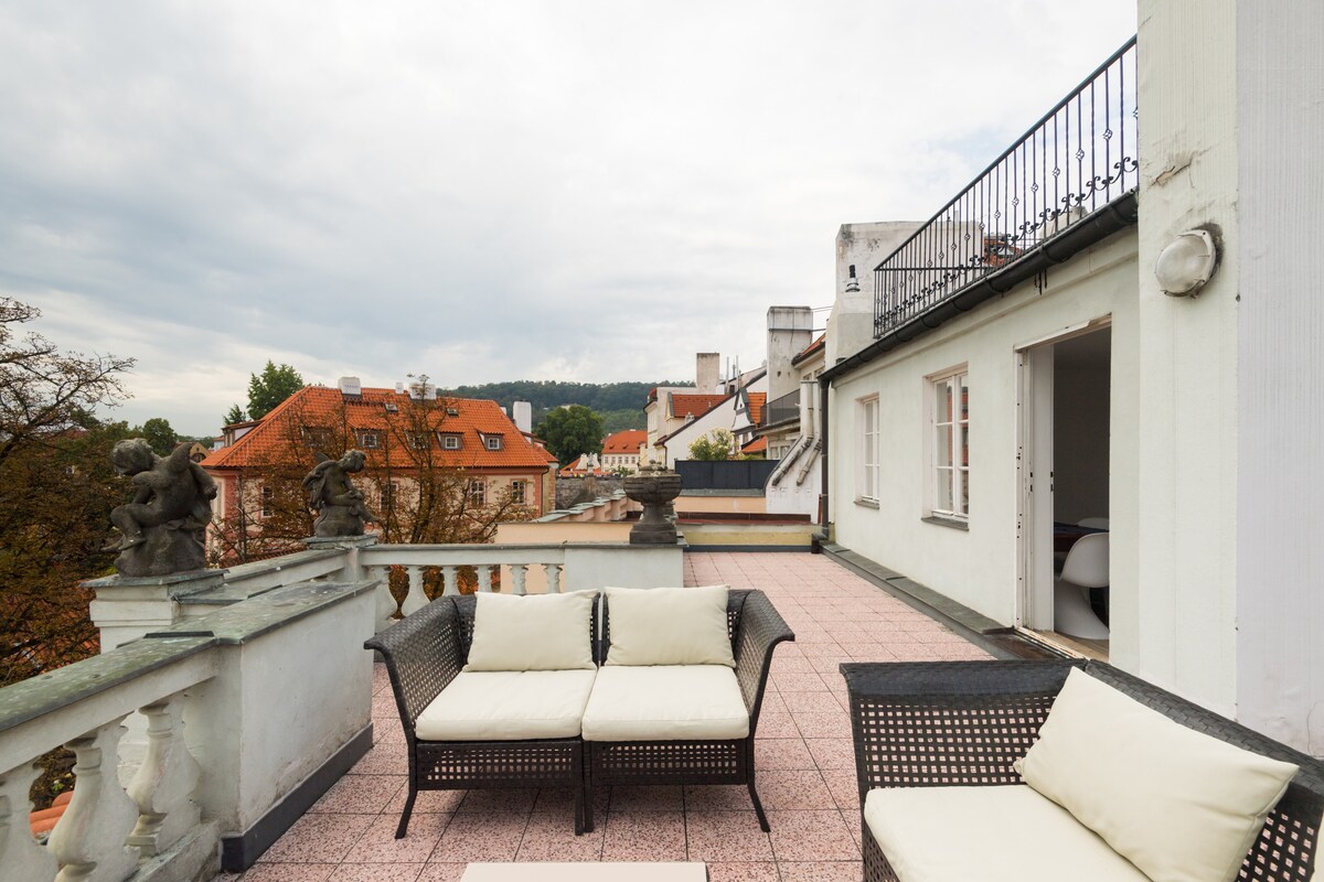 Ez a lenyűgöző apartman legfeljebb 6 vendég elszállásolására alkalmas, három kényelmes franciaággyal és egy opcionális kanapéággyal. A nappaliból varázslatos kilátás nyílik a prágai várra, az egyik hálószobából pedig a Károly hídra nyílik kilátás. A vendégek egy nagy privát teraszon gyönyörködhetnek, amely tökéletes reggeli kávéhoz vagy étkezéshez Prága elbűvölő látképének hátterében. Igazán emlékezetes szállás vár Prága szívében.