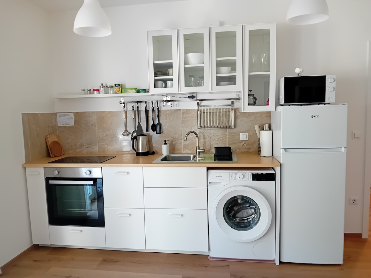 Apartma Babica, 34 m², enchants with warmth and comfort. It has its own entrance from the terrace, offering privacy and direct access to nature with a stunning view. Large sliding glass doors lead to another terrace area. The fireplace creates a cozy atmosphere on colder days—perfect for relaxing evenings with wine or a book. With a modern kitchen, comfortable bed, and quiet rest area, this apartment is ideal for couples or small families seeking a nature retreat near city attractions.