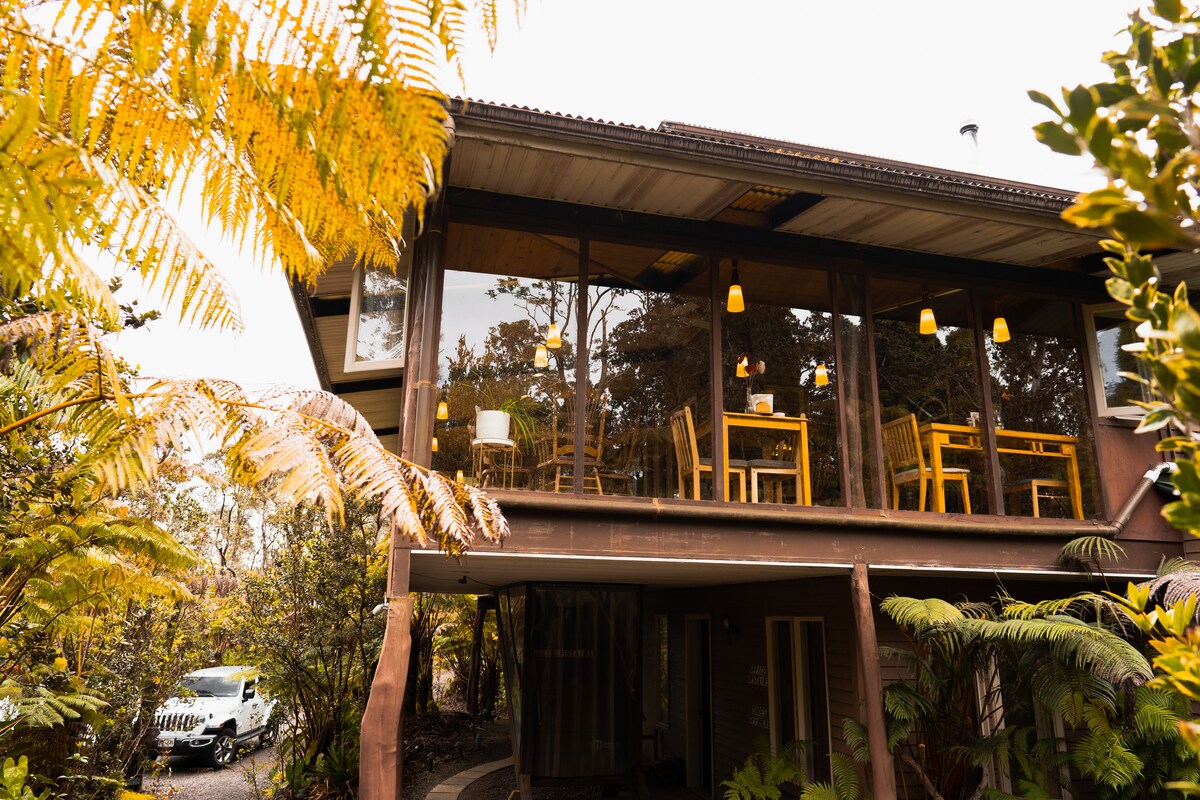 Egy rövid, erdős úton fogsz felsétálni egy privát, kulcs nélküli bejárathoz, amelynek első lanai ülősarokkal rendelkezik, kilátással az őshonos erdőre. Belül egy reggelizősarok található kenyérpirítóval, kávéfőzővel, vízforralóval és egy kis hűtőszekrénnyel. Hangulatos hálószoba íróasztallal és okostévével vár rád. Wi-Fi és kábeltévé biztosított. A saját fürdőszobádban zuhanyzó található. Az otthonom előtt álló erdőt nyugodtan felfedezheted. Az otthonom a Volcano Village-en belül található, mindössze 2 mérföldre a Hawai'i Volcanoes National Parktól.