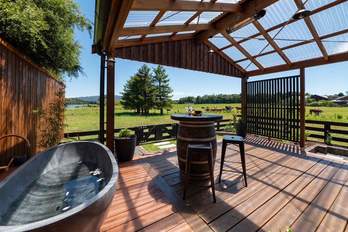 Rotorua glamping, szabadtéri szauna, kilátás a völgyre