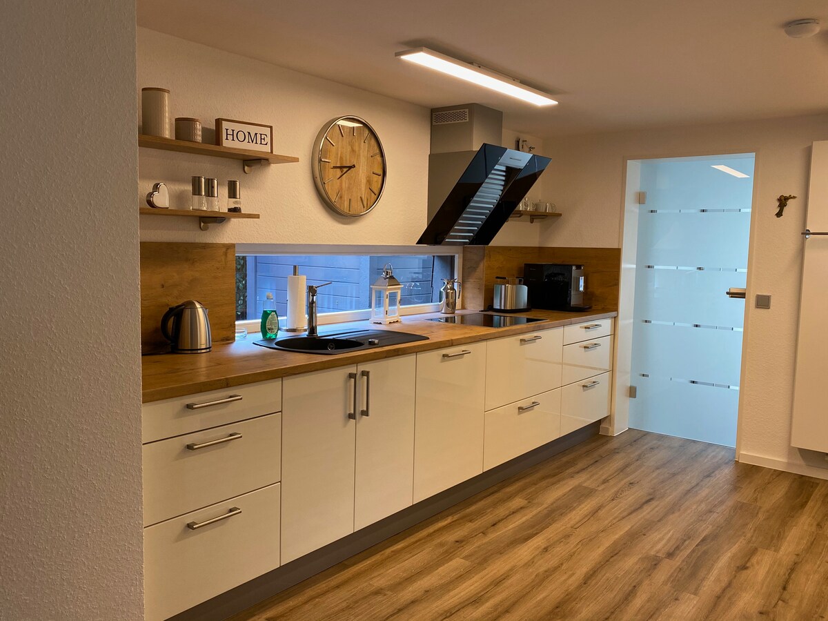 Kedves vendégek! Kínálunk egy kényelmes, teljesen felújított, modern, nagyon jól felszerelt lakást, amely vidéken található, és számos lehetőséget kínál a bukolikus sétákra. Szép kilátás a teraszról, privát hozzáférés, ingyenes privát parkoló két vagy több jármű számára, ha látogatókat vársz. Éjszakánként csendes, a természet mindenütt látható, egy „Rechter Backstube” pékség 10 percre autóval, egy szupermarket, egy borárus.