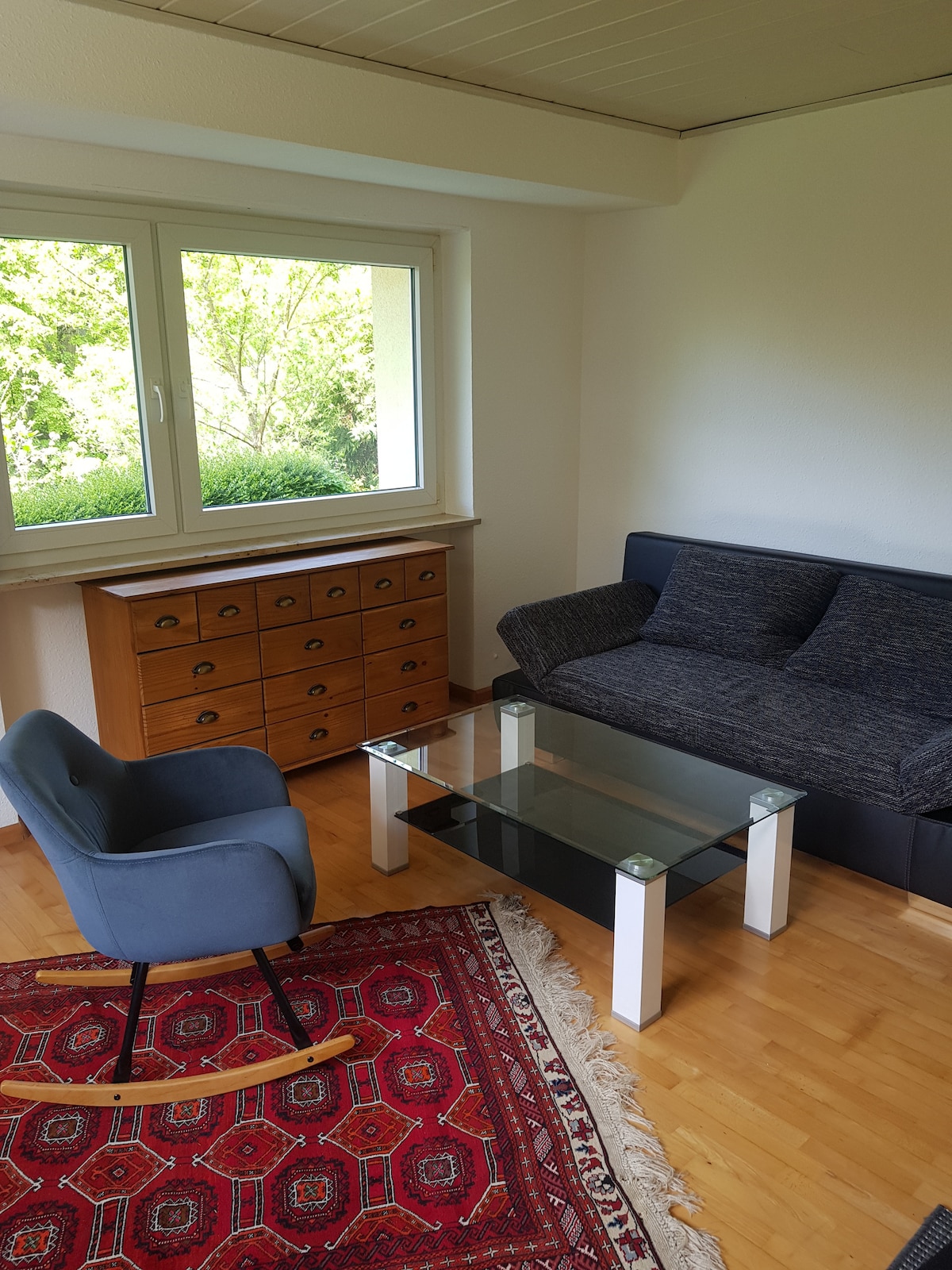 Die ca. 30 m² große Wohnung befindet sich im 1. OG. Die Wohnung ist komplett möbliert, incl. Handtücher und Bettwäsche. In der Küche befinden sich eine Senseokaffeemaschine, Herd, Backofen Toaster und Microwelle. Die Küche ist funktionsfähig aber etwas in die Jahre gekommen. Neue Küche ist für 2026 vorgesehen. In unserer Region gibt es zahlreiche Ausflugsmöglichkeiten (D, CH, FR). Schaut euch hierzu gerne den Reiseführer auf Airbnb an.