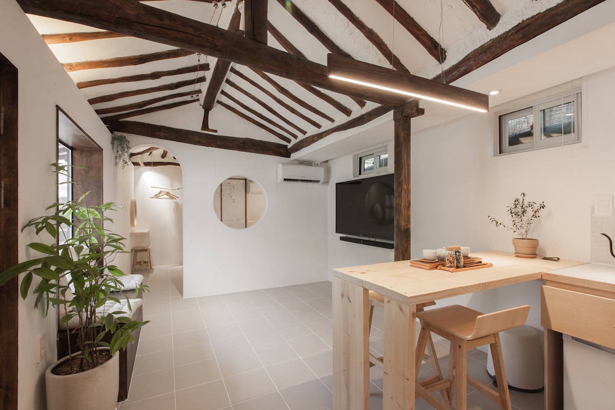 Ez egy hanok, amely a fürdőszobaajtó hagyományos ajtajával rendelkezik, hogy megőrizze a hagyományos Hanok megjelenését. Hanok Village szívében található, így kényelmesen élvezheted a Hanok Village romjait, éttermeket, kiállításokat, előadásokat, élményeket stb. Olyan elemekkel van felszerelve, amelyek élvezik a hanokot, például a hanok udvart, a tetőt és a padlót. Különösen minden helyiségnek más a jellegzetes hanok megjelenése, így igazán élvezheted a hanokot. A környék csendes, és még éjszaka is élvezheted a csapatunk idejét, de nem áll útban, így élvezheted. Ha esik, vagy hideg az idő, és találkozóhelyre van szükséged, ingyenesen bérelhetsz egy kávézót körülbelül 20 helyért.