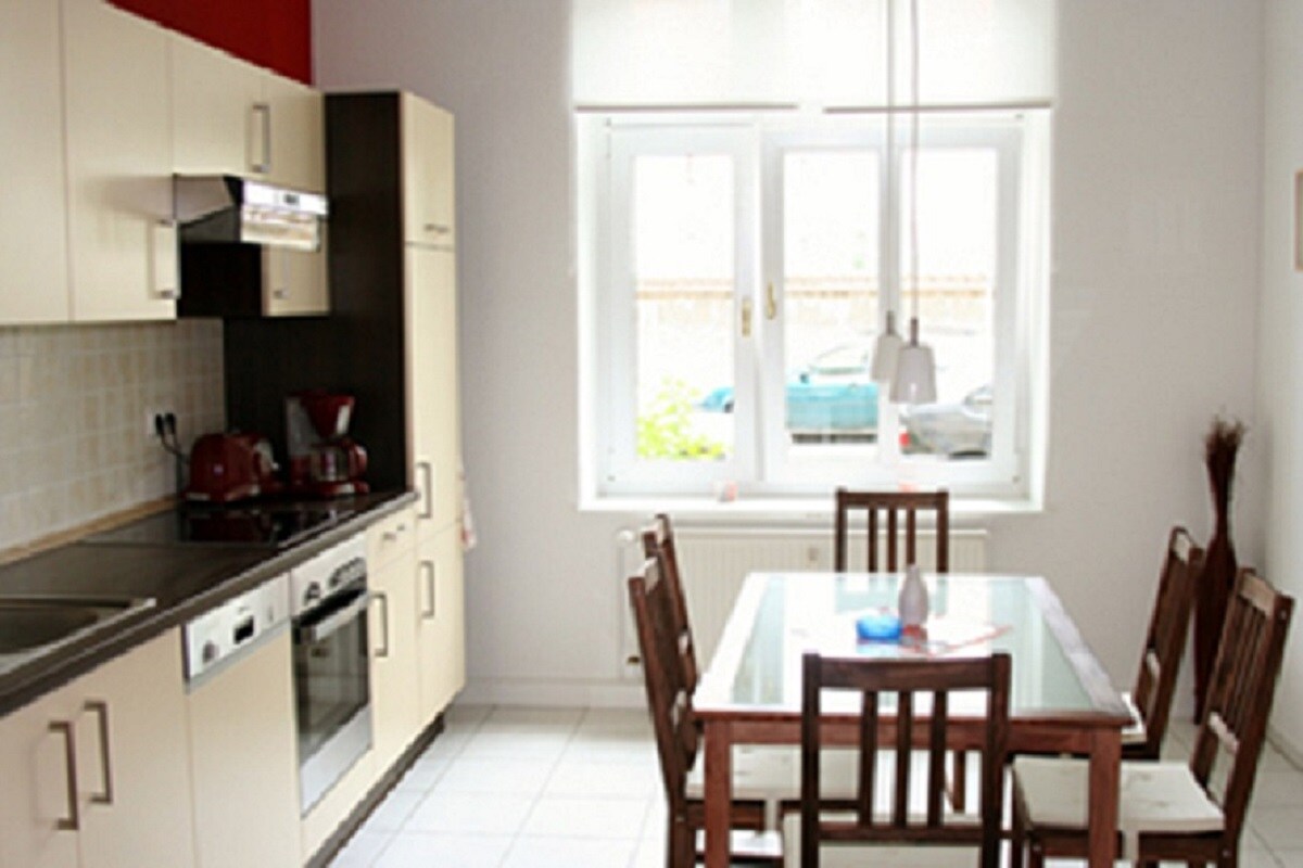 Az apartman egy lakóépületben ( 3 We) található a 2. szinten. 75 négyzetméteres, amely 1x nappaliból és 2x hálószobából, 1x konyhából és 1x fürdőszobából áll, káddal. A konyha teljesen felszerelt, és minden szabványos elektromos készülékkel fel van szerelve. Törölközőt és ágyneműt, valamint szatellit tévét és wifit is biztosítunk. Egy ingyenes parkolóhely használható a helyszínen. 20 méterre van Müritztől, és van itt úszómedence is. 5 perces sétával elérhető a városi kikötő, a városközpont és a nemzeti park bejárata.
