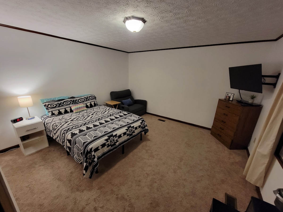 Újdonság 2024/2025-re... frissített bútorok memóriahabos kanapéággyal, memóriahabos king és queen méretű ágyakkal, további iker matrac a padlóhoz az extra alvási lehetőségekhez. Szabadtéri társalgó! Világos és tágas hintó, a főépület mögött, az ohiói Libanonban. Közel Libanon belvárosához, Springboróhoz, Waynesville-hez és rövid autóútra Kings Islandtől. -Kings Island 11 mérföld - Warren County Sports Park 7 mérföld -Roberts Center Wilmington 20 mérföld -Caesar Creek State Park 10 mérföld