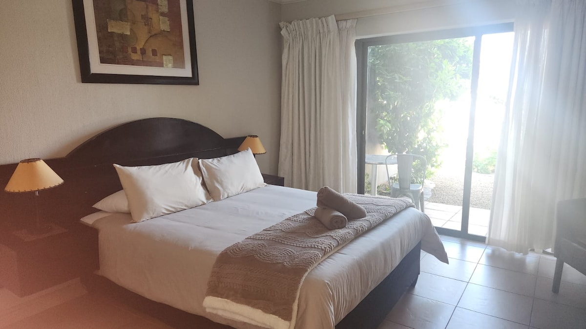 The deluxe queen room features a queen-size bed ,an en-suite bathroom with a shower. For entertainment, it offers a TV and Wi-Fi. Guests can also enjoy tea and coffee-making facilities, a microwave, and a private patio with a garden view for relaxation.