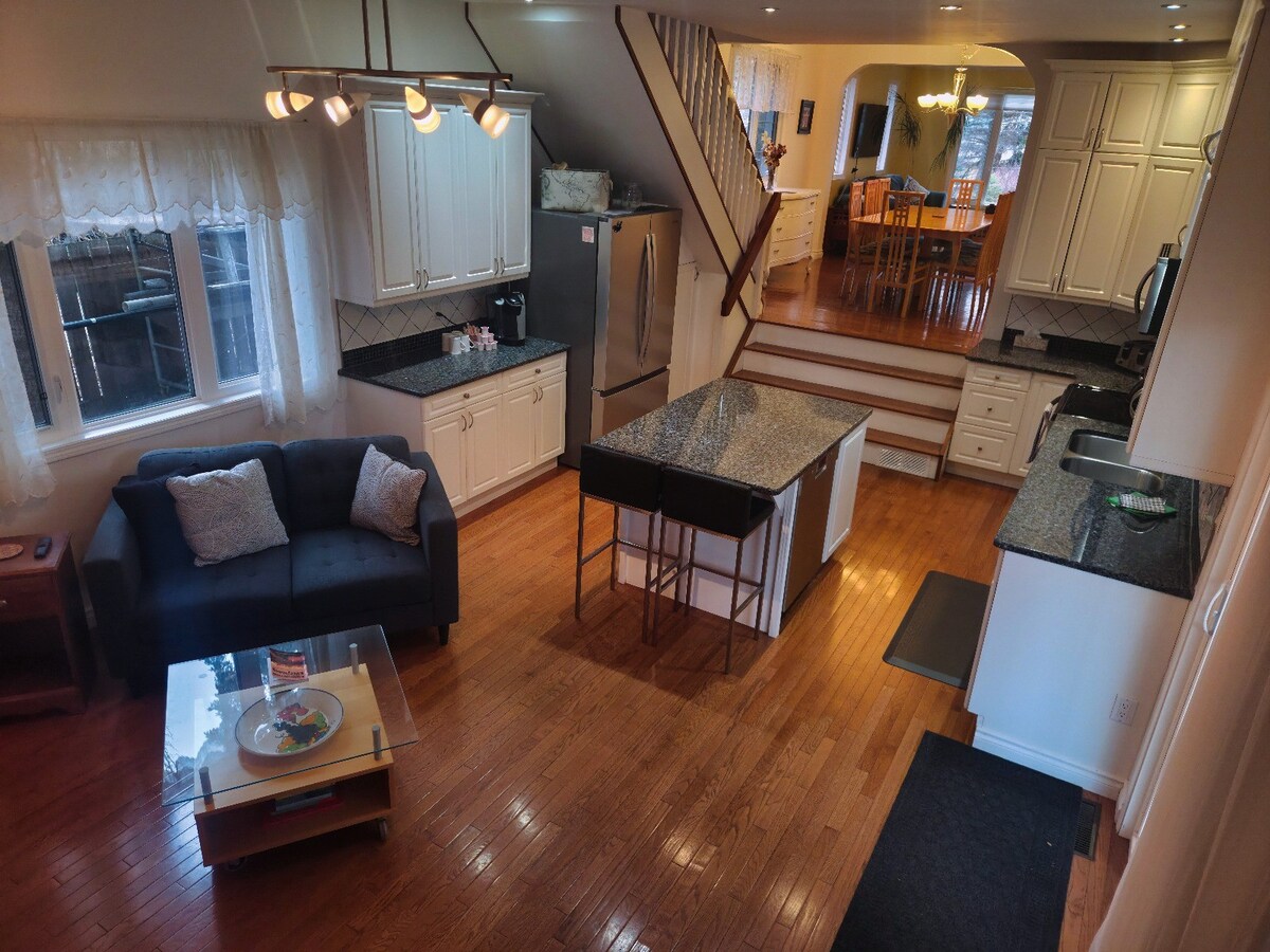 Új ház a West Edmonton Mall (4 km-re) és Edmonton belvárosa (7 km) közelében, csendes környéken, családbarát, tágas, teljes kényelmi szolgáltatásokkal. Élvezd az 1500 négyzetlábat. - 2 emeletes, 1/2-es duplex otthon. Nem osztod meg a házat senkivel, amíg nálunk szállsz meg. Kulcs nélküli belépés az egyszerű érkezés és távozás érdekében. Éjjel-nappali megfigyelés kültéri kamerával. Rengeteg utcai parkolóhely áll rendelkezésre. Nappali, étkező és konyha - Nyitott koncepció, így nagyszerű családi összejövetelekhez