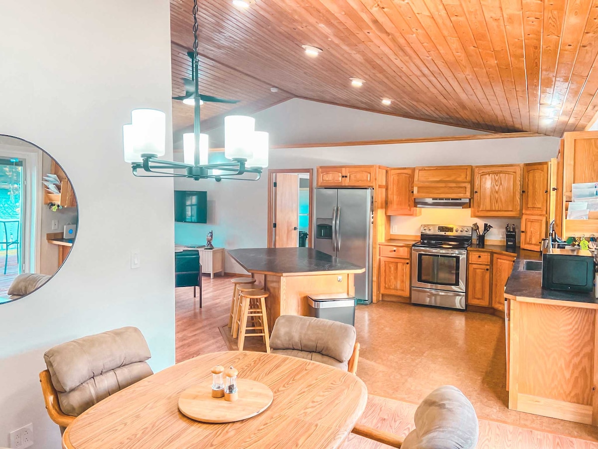 Ez a tágas, 3 hálószobás, 3 fürdőszobás Glacier National Park nyaraló az otthon minden kényelmét kínálja. A fő szinten található egy étkező, egy nappali, egy konyha és egy reggeliző sarok. A fő szinten 2 teljes fürdőszoba és három hálószoba található queen méretű ággyal. Az emeleten teljes loftlakás, emeletes ágyak és még két queen méretű ágy található, rengeteg alvóhely az egész csoportnak! Fürdőszoba és szórakozóhely is rendelkezésre áll TV-vel és összecsukható pingpongasztallal.