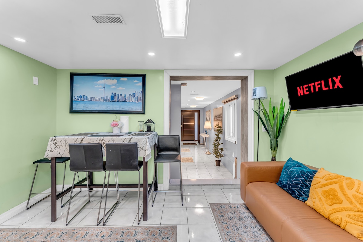 Menekülj el az Ajaxban található modern alagsori lakosztályunkba, amely mindössze 10 percnyi autóútra található az Ajax Waterfronttól és a 401-es út közelében. Ez az újonnan felújított hely ötvözi a stílust, a kényelmet és a kényelmet a felejthetetlen tartózkodáshoz. Élvezd a privát bejáratot, amely egy nagy hálószobához vezet egy plüss queen méretű ággyal és egy stílusos fürdőszobával, amely tele van alapvető kellékekkel. Pihenj a modern nappaliban, ahol kényelmes kanapé és intelligens TV található teljes konyhával, Wi-Fi-vel, külön munkaterülettel és mosási lehetőségekkel.