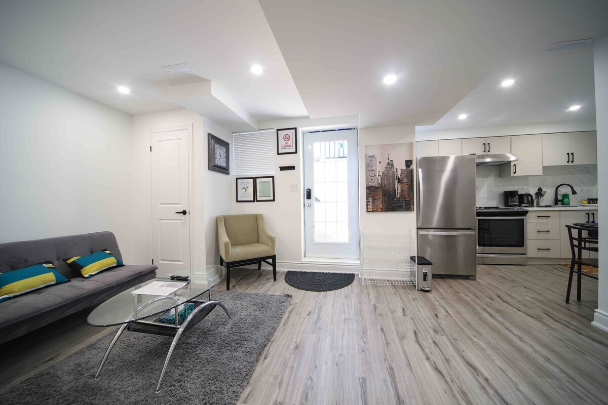 PRIVATE Walk Out Basement Apartment W/Separate Entrance. 420 Sq.Ft space. Queen Sized Bed. Oversized Shower w/ Rainfall Shower-head. Microwave, Two Mini Fridges, Coffee/Hot Water Tea Maker. Please note: not a full kitchen. Dining/Work Table w/Benches. High Speed Wi-fi. Living Room w/ Reclining Lazy Boy Couch and 50” Smart Tv. Over 1000 Live Tv Channels and Netflix. Private Little Backyard Patio w/Table. Private Driveway ( 2 Cars). 1 Min Drive to Hwy 401. 15 Min Walk to Ajax Go Station.