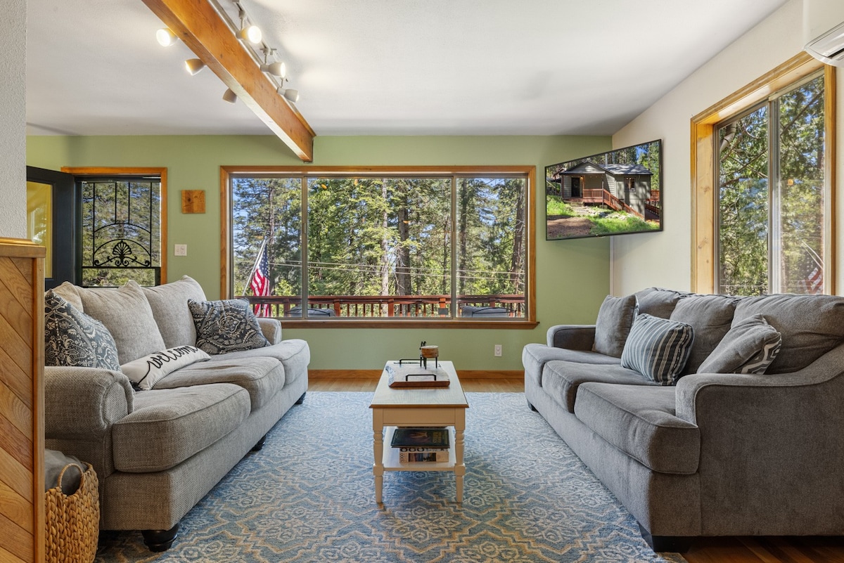 This cabin has been recently remodeled with high end furnishings and appliances in a quiet setting but close to the local amenities. Each bedroom has a California king-size bed and a Wifi connected smart TV. There is a 50" flat screen in the living room, 3 Sonos speakers to play your music and the kitchen is stocked with plenty of Williams Sonoma cookware, knives, and dishes.
