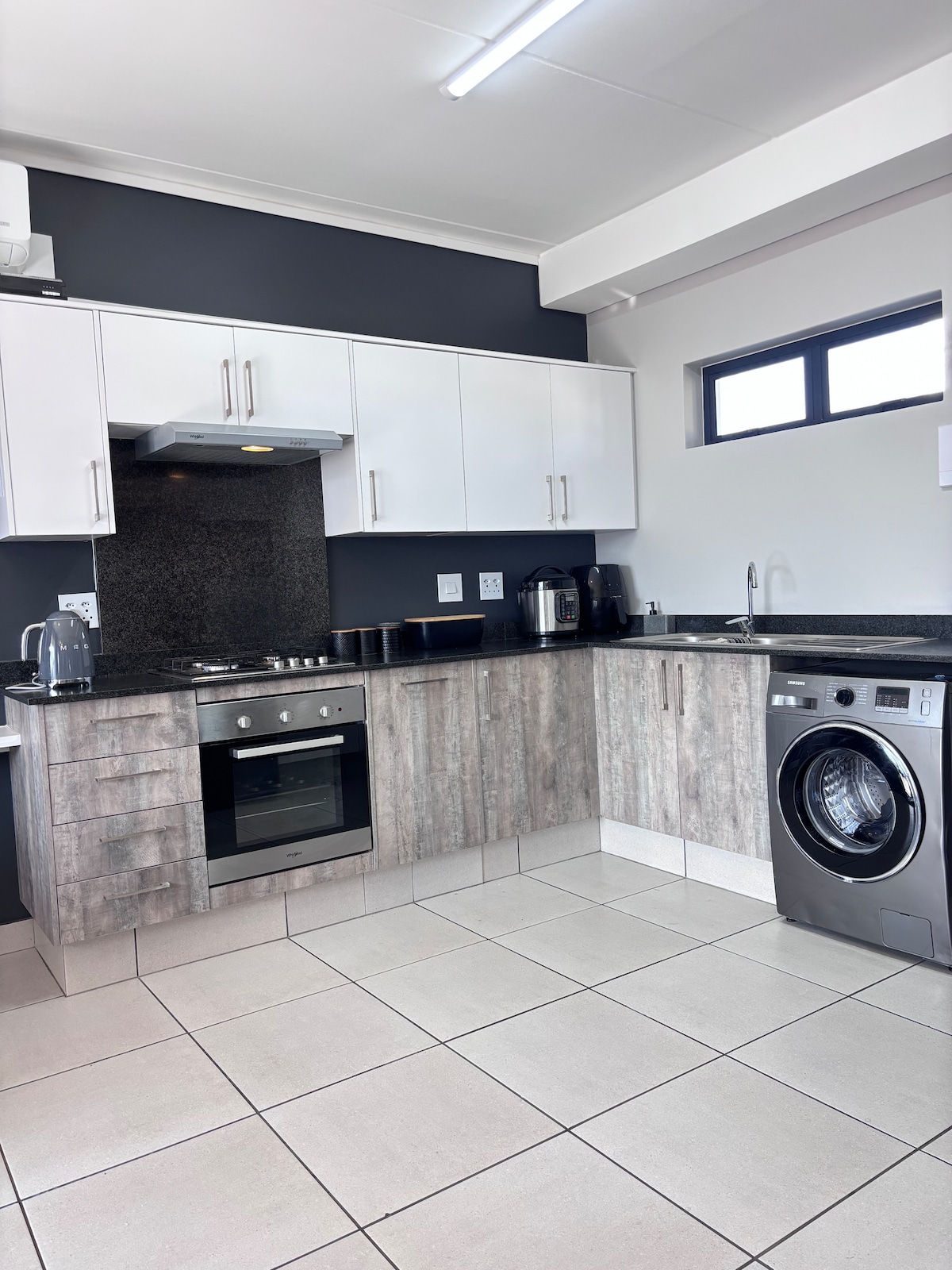 Self-catering, quiet neighborhood. Safe parking with own entrance. 0.5 km from Mediclinic hospital and West End shopping center with Spur, Debonair and Fish a way. Food deliveries available. 2km from Innibos, public transport available. Extra beds available.