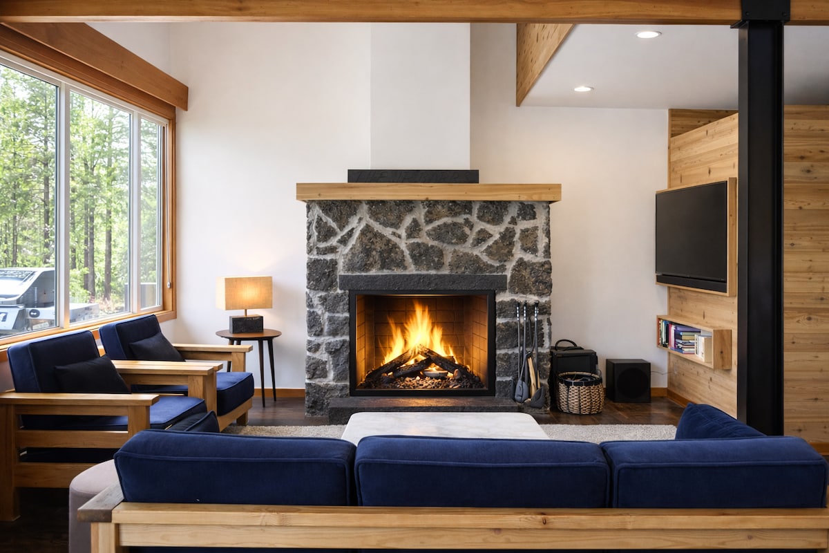 Menekülj a természet szépségébe ezen a nyugodt menedékhelyen, amely a Sandy-folyóra néző 23 hektárnyi erdős területen található. Kortyolj kávét a fűtött, körbefutó teraszon, gömbölyödj össze a kőkandallónál, vagy áztasd magad a csillagok alatti pezsgőfürdőben. Túrázz a privát ösvényeken, fedezd fel a tavat, és lazíts a szaunában. Átgondoltan berendezett pihenésre, hangulatos zugokkal, könyvekkel és lélegzetelállító kilátással. Jól képzett kutyákat szívesen látunk! Súlyos tulajdonosi allergia miatt nem lehet macska vagy más háziállat.