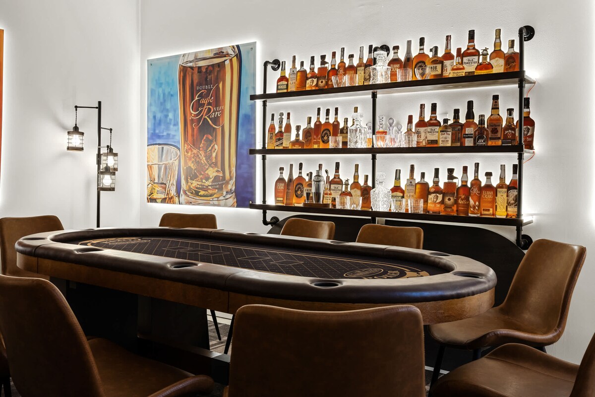 Perfect for groups seeking an authentic Kentucky escape, this spacious two-story home is ideal for bourbon trail adventures, horse racing trips, and enjoying small-town charm. The home features 4 comfortable bedrooms and a game room with poker table, arcade machine and shuffleboard. Gather outdoors by the firepit, relax in the hot tub, or unwind together after a full day of exploring. High-speed WiFi, smart TVs, free parking, and easy self check-in ensure a seamless, memorable stay for everyone.