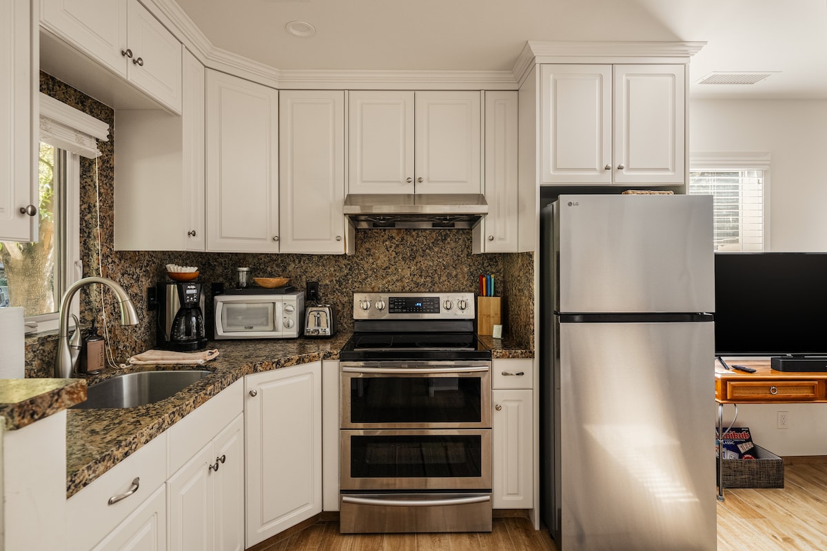 DISCOUNT LONG TERM STAYS! This chic farmhouse style studio is fully renovated and professionally designed. Our home can comfortably fit up to 4 people. The home includes pull down blackout shades throughout, queen sized memory foam bed, A/C & heating unit, printer, fast Wi-Fi, Cable TV, 65 inch Smart TV, fully stocked kitchen with all cookware and basic spices, plush linens, shampoo/conditioner/body wash, spacious bathroom with large walk-in shower, and laundry basket with in-unit washer/dryer.