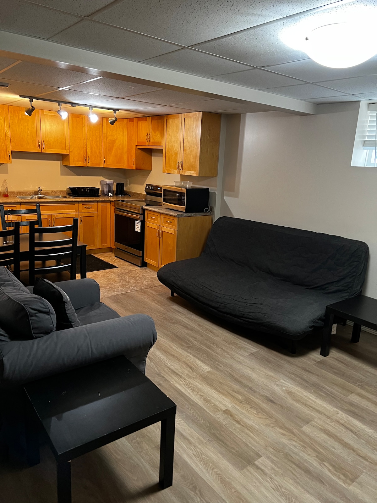 Our cozy basement apartment comfortably accommodates six guests. It features a master bedroom with a queen bed, a second bedroom with two twin beds, and two additional rollaway twin beds. The apartment includes a fully equipped kitchen and laundry facilities. Located near 1st Street, it’s just a short (~5-minute) drive to downtown.