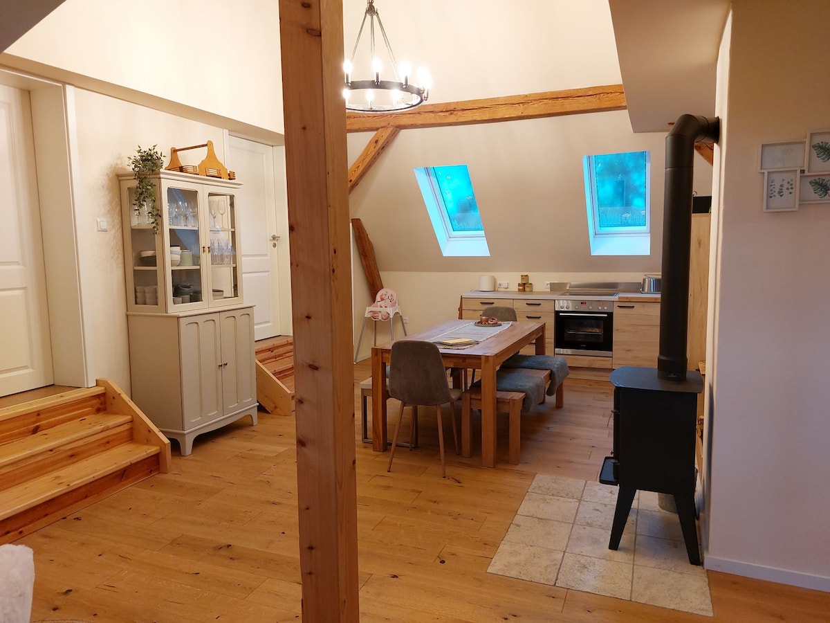 A falu tavának hátterében, csak rétekkel és szántóföldekkel körülvéve fekszik a kis udvarház, a főépülettel és a régi istállókkal. Az elmúlt öt évben gondosan helyreállítottuk, új életet leheltünk az 1899-es birtokba. A vidéki udvarház felső szintjén – egy téglaépületben, ami tipikus a régióra – egy tágas, fényes, 114 négyzetméteres lakás vár rád. A régi gerendák ismét láthatóvá válnak. A belső tér egyszerű, és nem vonja el a figyelmet.