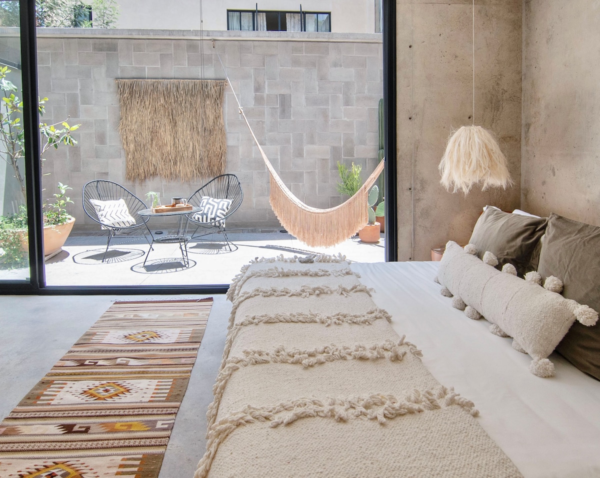 Hangulatos és világos loftlakás Escandónban, növényekkel körülvett privát terasszal. Tökéletes a pihenéshez, a munkához vagy egy csendes kiruccanáshoz. King-size ágy, teljesen felszerelt konyha, külön munkaterület és beltéri függőágy, amely tökéletes olvasáshoz vagy pihenéshez. Biztonságos és központi helyen, mindössze néhány percre Condesától és Chapultepectől. A hozzáférés az otthonunk közös területein keresztül, egy keskeny lépcsőn keresztül történik. Melegség, privát szféra és átgondolt részletek, hogy otthon érezd magad. Nagyon örülnénk, ha vendégül látnánk!