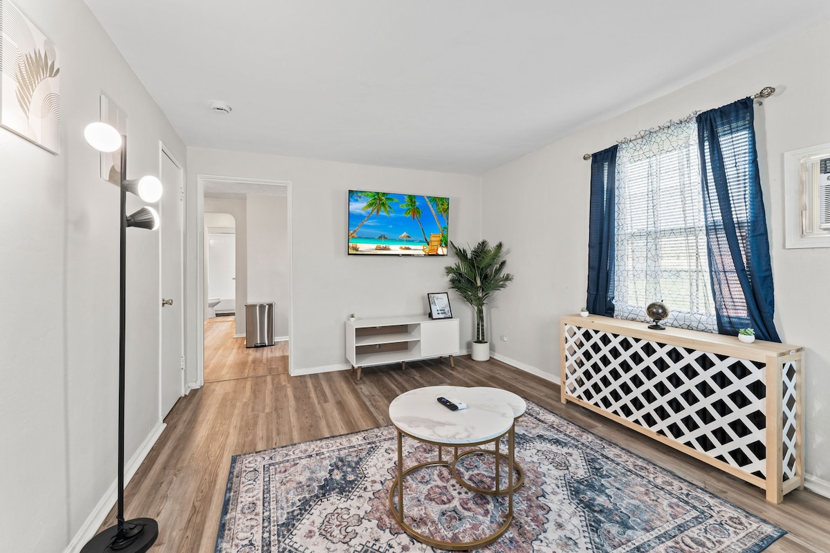 Enjoy a stylish experience and stay at this centrally-located apartment with all new furnishings! Freshly renovated, new washer and dryer, electric fireplace, free wifi and an extra bed in the pull out sofa. Clean and spacious kitchen for any cooking needs with a dining table with seating for 4.