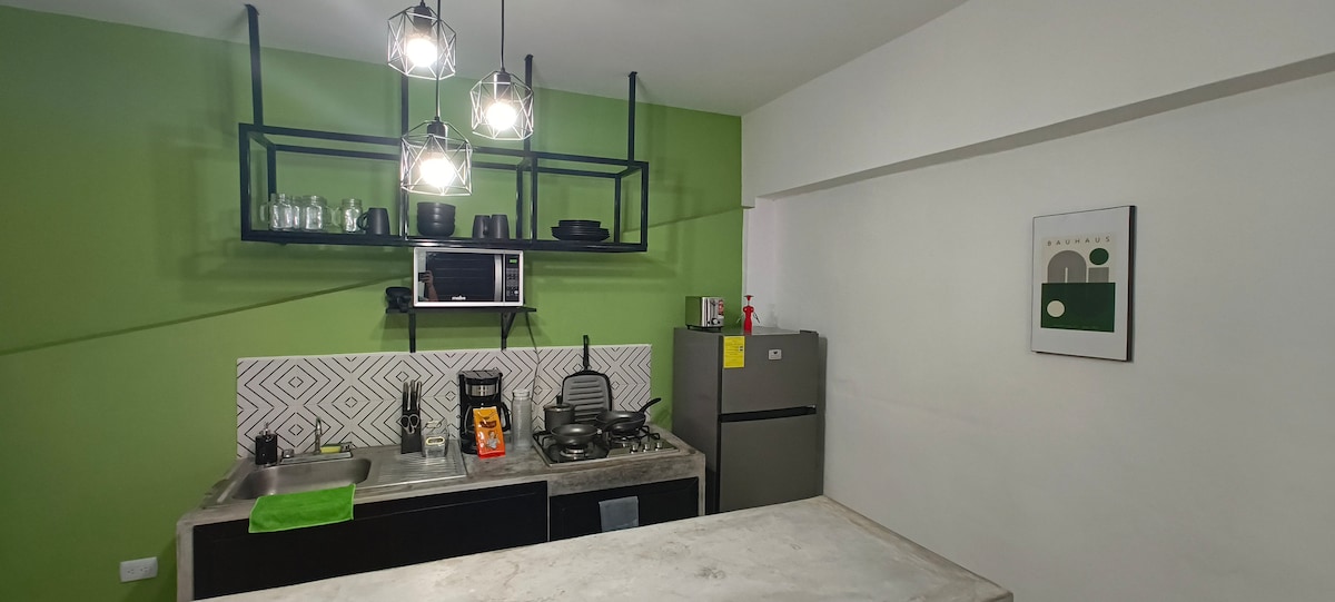 Cómodo pequeño departamento que ofrece un espacio seguro para descansar. Localizado cerca de parada de autobús, tienda y avenida principal con facilidad de moverse a plazas comerciales cercanas. ¿Lo más importante? Muy seguro y tranquilo en el que se podrá descansar y aprovechar de unos buenos días de descanso y bien equipado justo con lo necesario. Se encuentra en una segunda planta pero con un acceso cómodo.