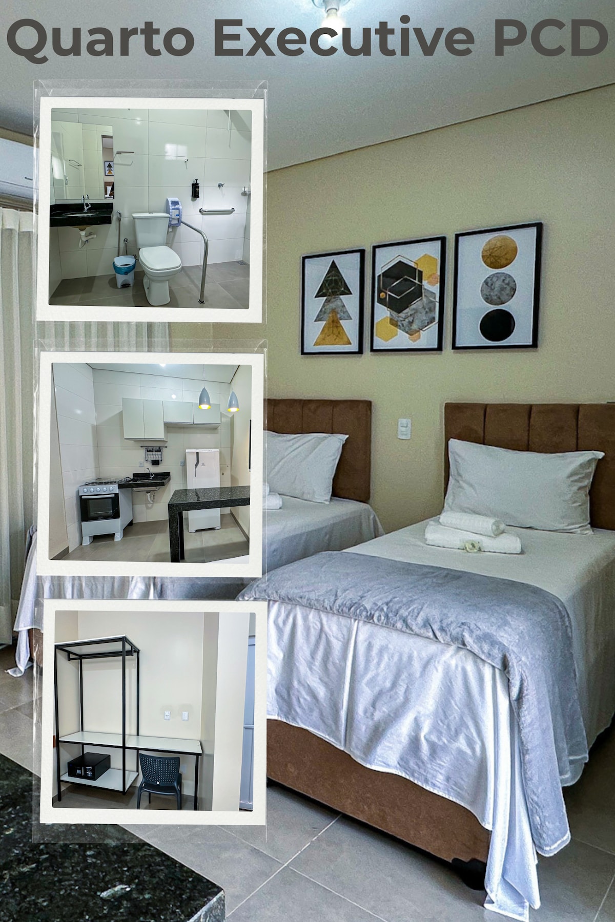 Flat & Hotel Executive: Unidades mobiliadas. Suítes modernas com Wi-Fi, ar-condicionado, TV a cabo, conveniência 24h, lavanderia 24h com uso independente, gerador, estacionamento e recepção 24h e café da manhã incluso.
