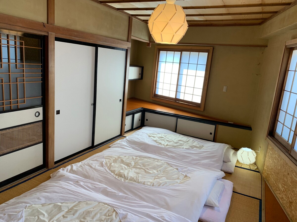 Our private room features 1 or 2 futon beds on traditional tatami floors. The shared areas include bathrooms, dining space and a work/lounge/library area. The hostel Saruya Hostel opened in 2015 in Fujiyoshida, a city at the bottom of Mt Fuji. We renovated an 80 years old wooden house to create a place that allows our guests to experience time and space through carefully selected art, design and objects, mixing traditional Japanese inspiration with modern aesthetics.