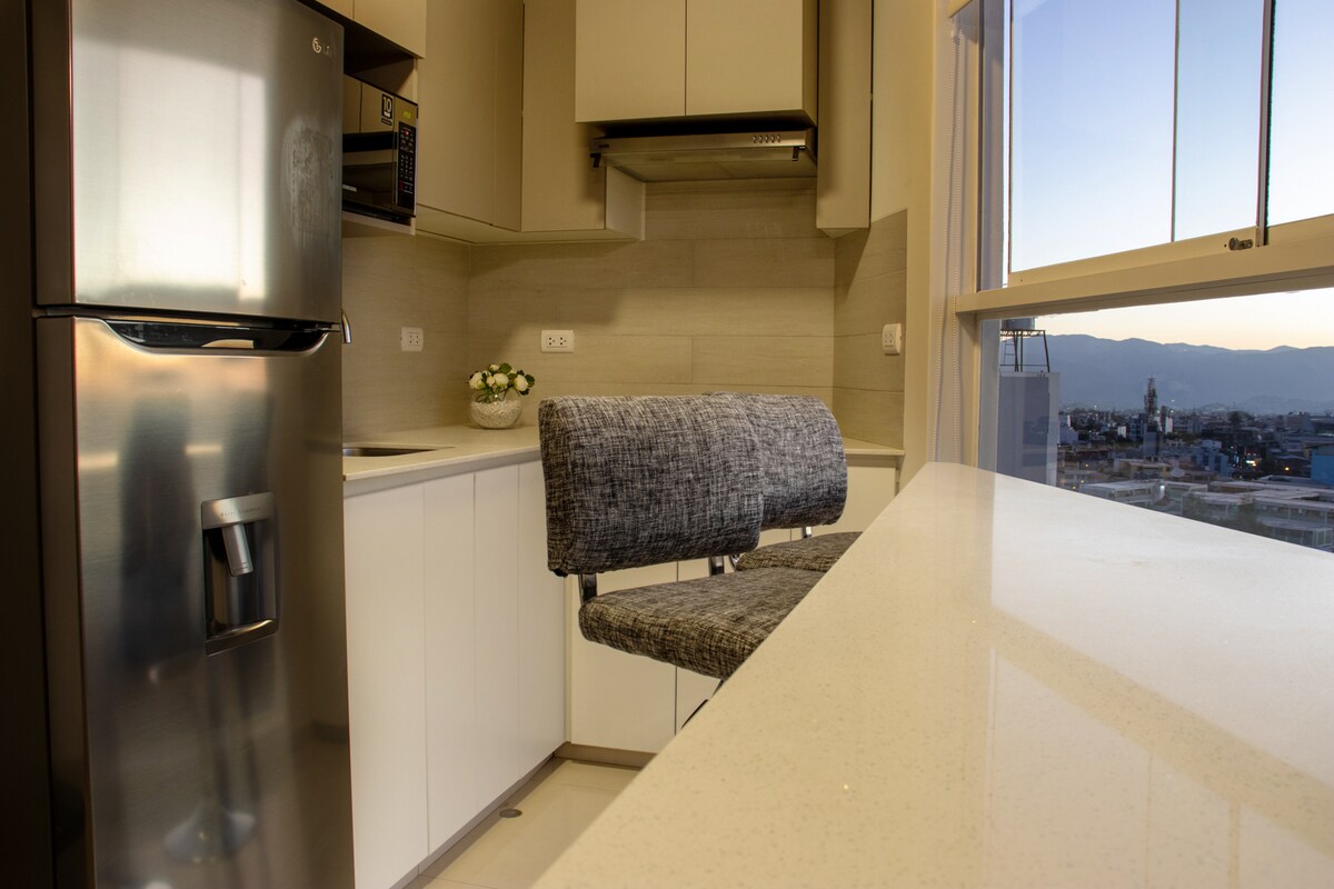 Élvezd a modern épület 4. emeleti első osztályú lakását, amely a legmodernebb főzárral rendelkezik, és Arequipa csendes részén található. Két kényelmes és hangulatos hálószoba saját fürdőszobával, amerikai stílusú konyha-étkező és egy nagy közös grillterület az emeleten Wifi és TV-szolgáltatások streamingcsatornákkal és filmekkel Háziállatok, bulik és összejövetelek nem engedélyezettek Legfeljebb 4 személy