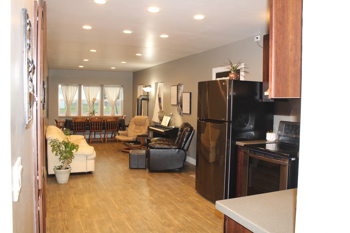 Kínálunk egy nagyon tágas, 1200 négyzetméteres privát kertszinti lakást konyhával, nappalival, káddal, két saját hálószobával, nagy festői ablakokkal és egy privát bejárattal. Hullámok kaphatók a vadászoknak. A családunk az emeleten lakik. Gyűjts friss csirketojást reggelire, simogasd meg a kutyáinkat, vagy ülj le egy tűzrakóhely körül esténként. 1 órányi autóútra Yellowstone keleti bejáratától. Élvezd a festői kilátást a hegyekre, a grillezőt, a tűzrakóhelyet és a kis családi farmok ízét.