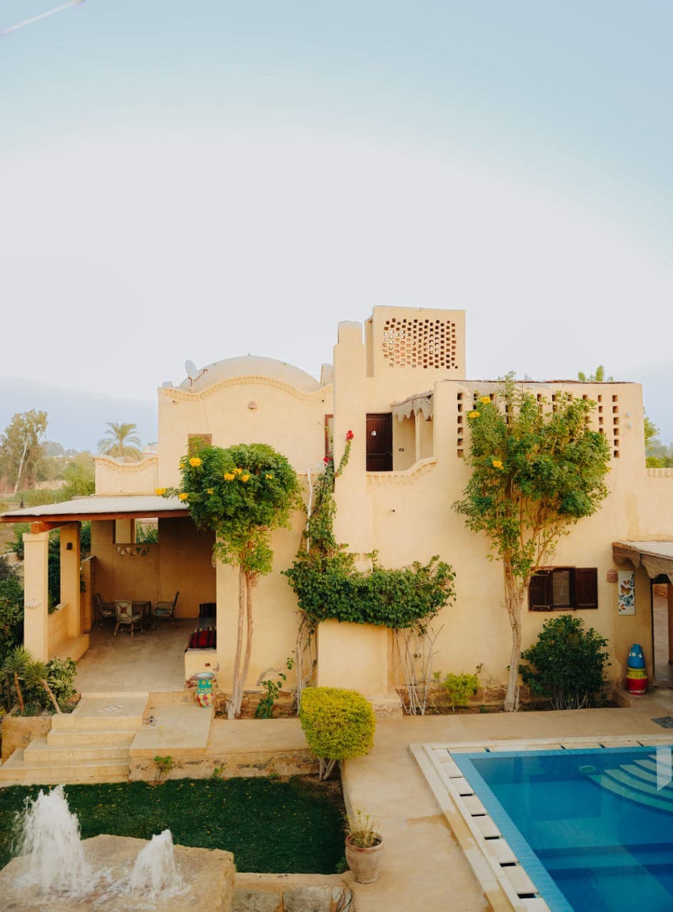 A uniquely architected private accommodation in Tunis Village overlooking the scenic Qarun lake. The living space includes the 1st floor of a gorgeous villa with a beautiful garden and outdoor pool, featuring 2 large bedrooms, a kitchen, living/dining hall, upper terrace and a full bathroom.