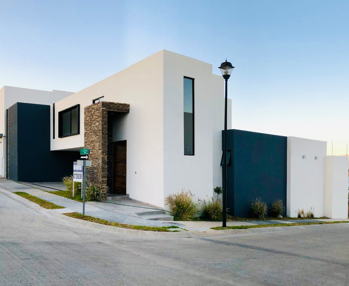 Disfruta de León en un alojamiento cómodo y seguro, rodeado de Áreas verdes, a la vuelta de Parque los Cárcamos y del Parque Metropolitano. Hasta para 7 personas -Tres Habitaciones -2 camas queen size. 1 cama individual. 1 sofá cama. 1 sleeping. -Cocina Equipada -Microondas. Estufa de inducción. Refrigerador -Kit de Bienvenida -Dos Baños Completos, Calentador solar -Proyector Full HD. Roku, Netflix -Cochera y cajón exterior -Pet Frendly (Jardín) -Work Desk -Wi-Fi -Caseta de Seguridad