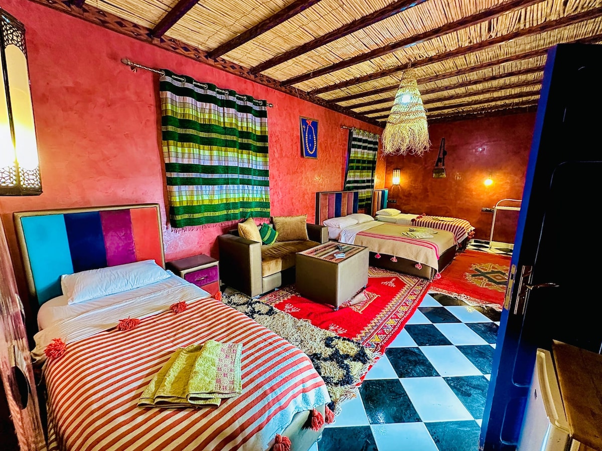 mhamid távoli nagy dűnéinek (homoktenger) tövében vagyunk Marokkóban, messze a kitaposott ösvénytől. A táborokat kisebb, gördülő dűnék veszik körül a magánélet és a menedék érdekében, amelyek nagyszerű kilátást nyújtanak a naplementére és a napfelkeltére .